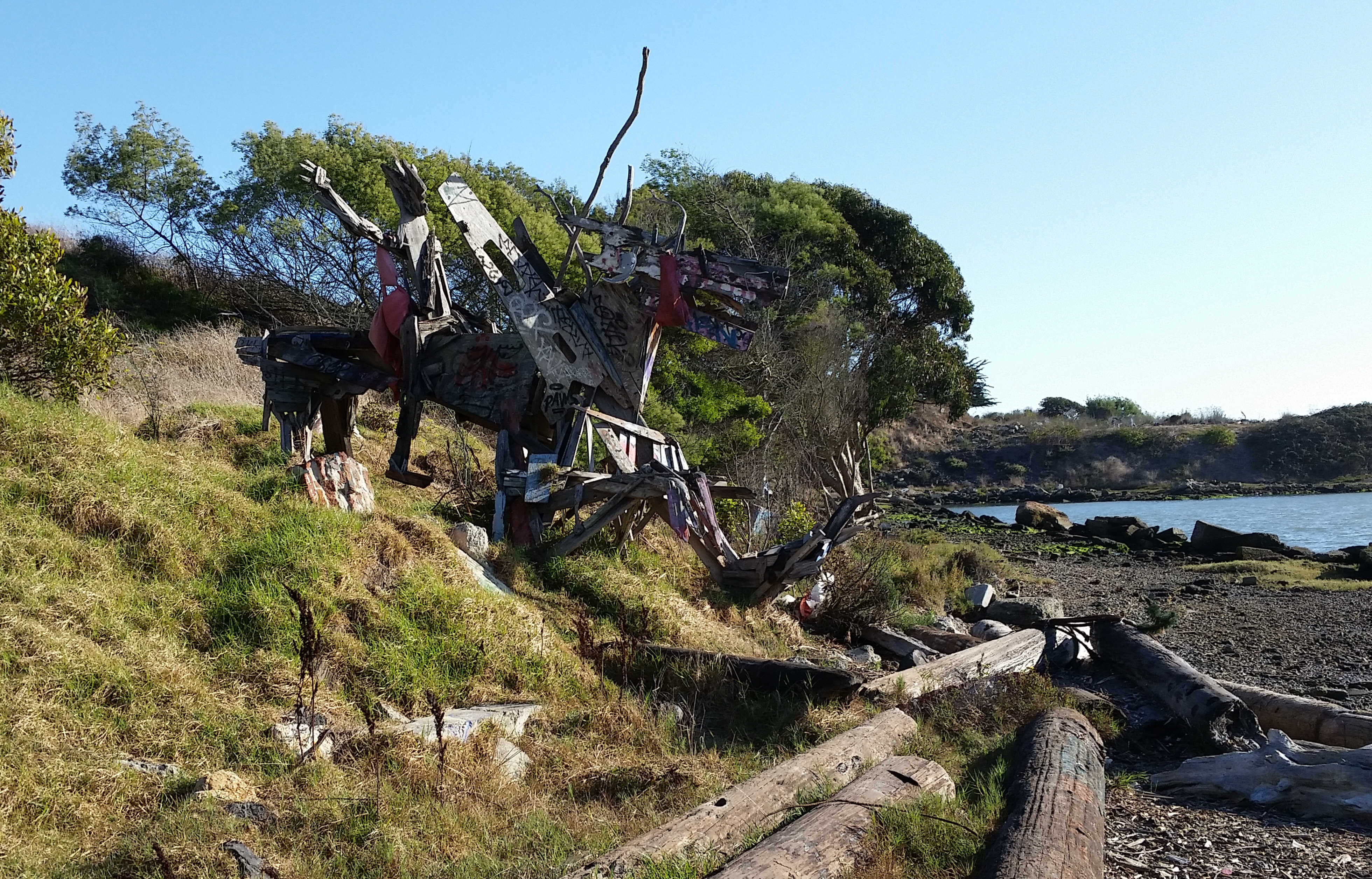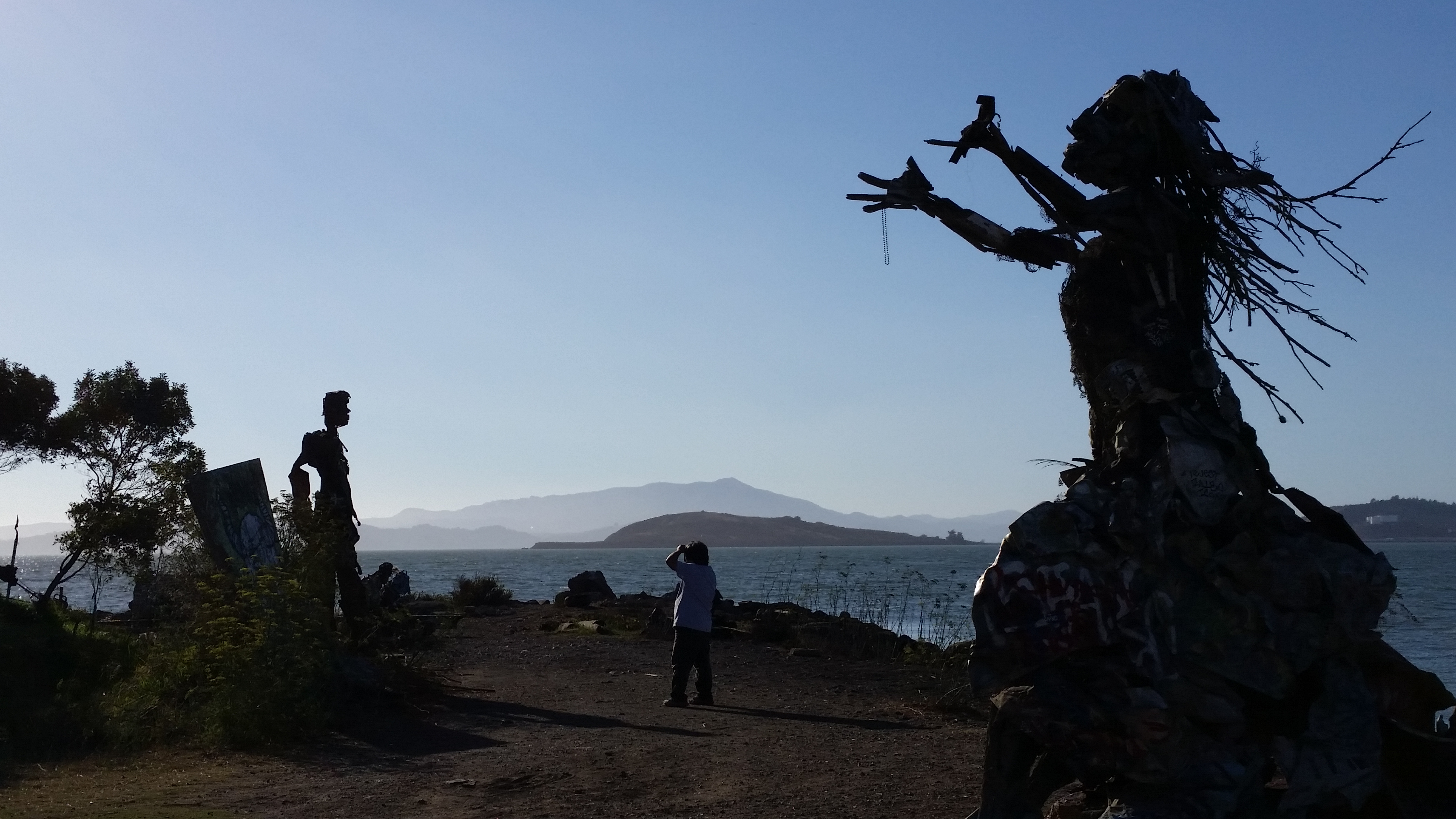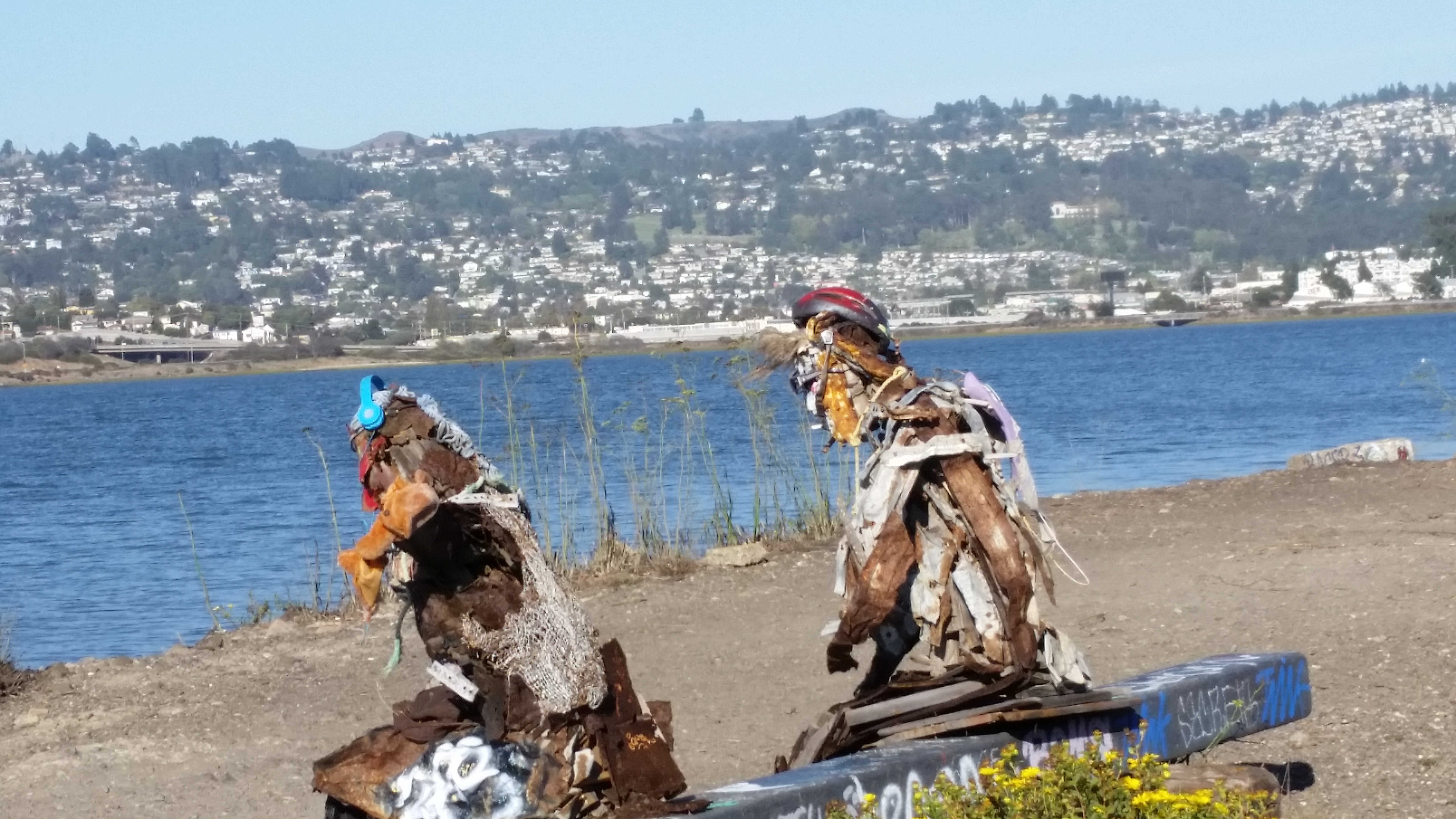 In the midst of a complicated stew of people and competing interests, a multi-authored creative vision united in spirit has arisen from this mound of detritus. The art that stands and dangles and juts all over the Bulb, just like the art that used to grace the Emeryville Mud Flats, is a monument to the free-wheeling, nature-centered, found-object California art aesthetic.