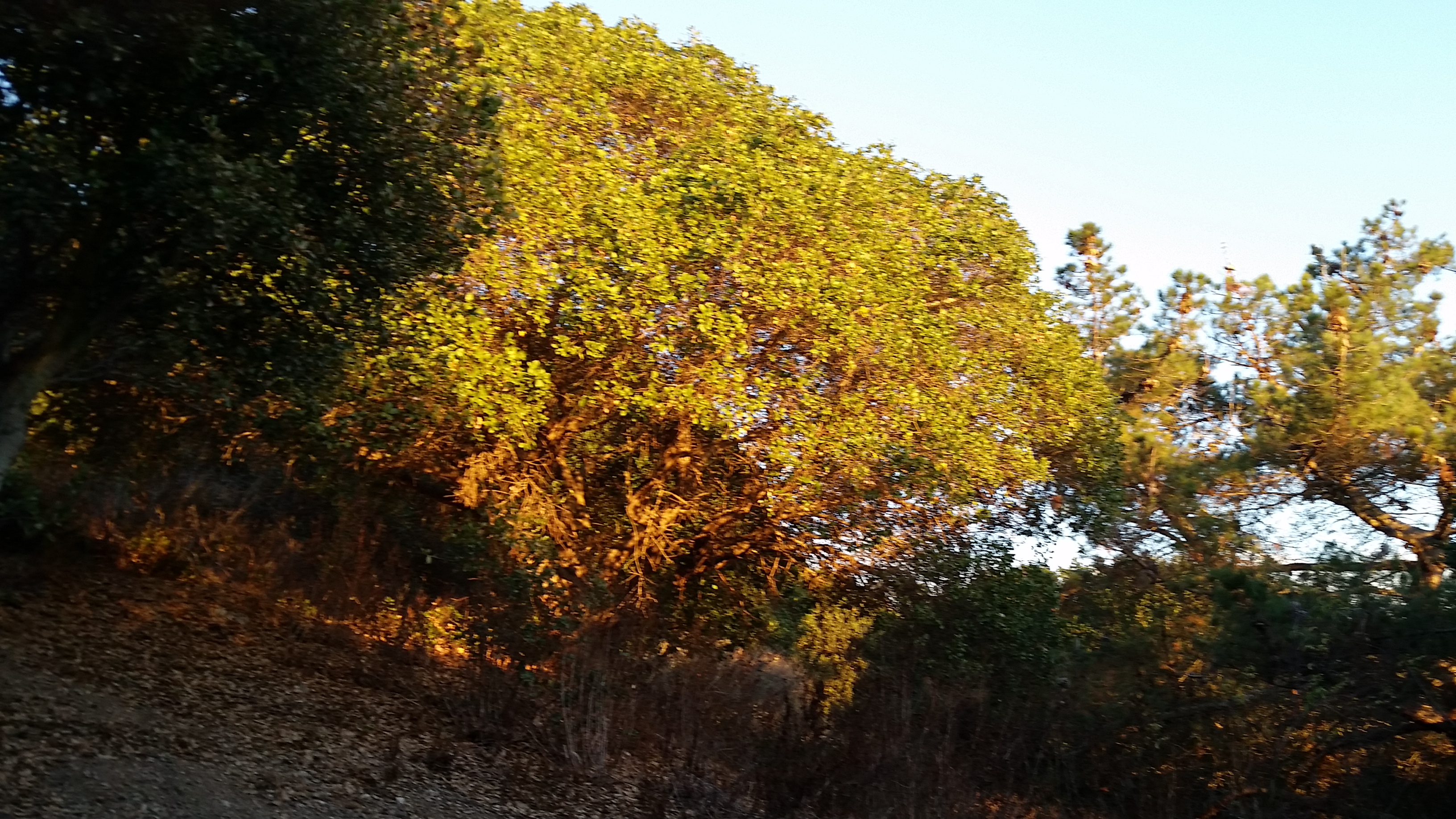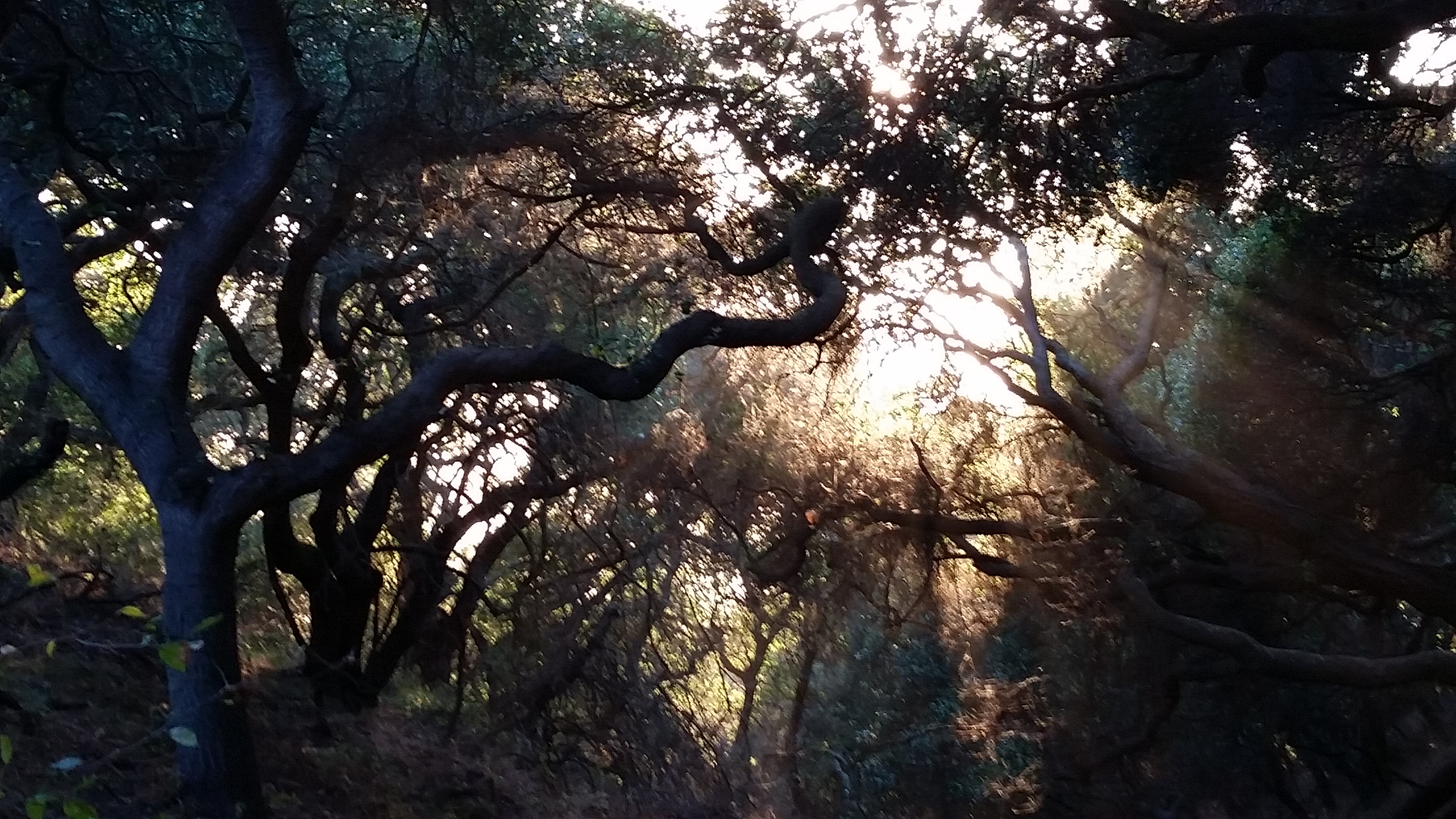 From its start in a stand of eucalyptus trees, the trail then moves on to an open hillside, with two benches suitable for views, rest or just silent contemplation. Moving on, we pass under the eponymous oaks and into the first of two small canyons that contain branches of Wildwood Creek (or would, if we ever got any rain). The main channel of Wildwood Creek forms part of the boundary of the southern section of Hillside Natural Area, and higher up the creek can be seen in the Madera Open Space. Eventually these branches meet the main branch somewhere underground in the flats, and Wildwood is itself eventually joins Baxter Creek, which finds the bay in Richmond northwest of Point Isabel.