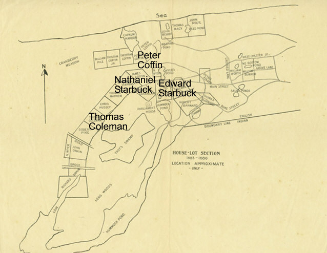 The Indian deed of 1671 was to “Tristram Coffin, Thomas Macy, Richard Swayne, Thomas Bernard, John Swayne, Mr. Thomas Mayhew, Edward Starbuck, Peter Coffin, James Coffin, Stephen Greenleafe, Tristram Coffin, Jr., Thomas Coleman, Robert Bernard, Christopher Hussey, Robert Pyke, John Symth, and John Bishop.